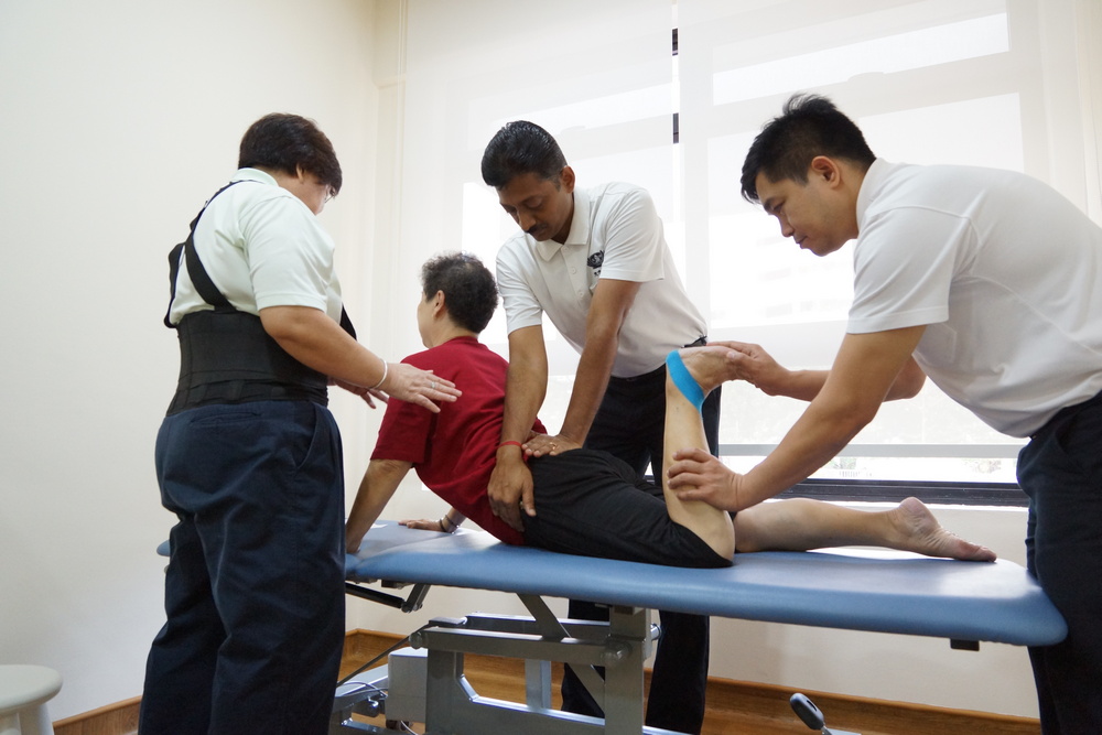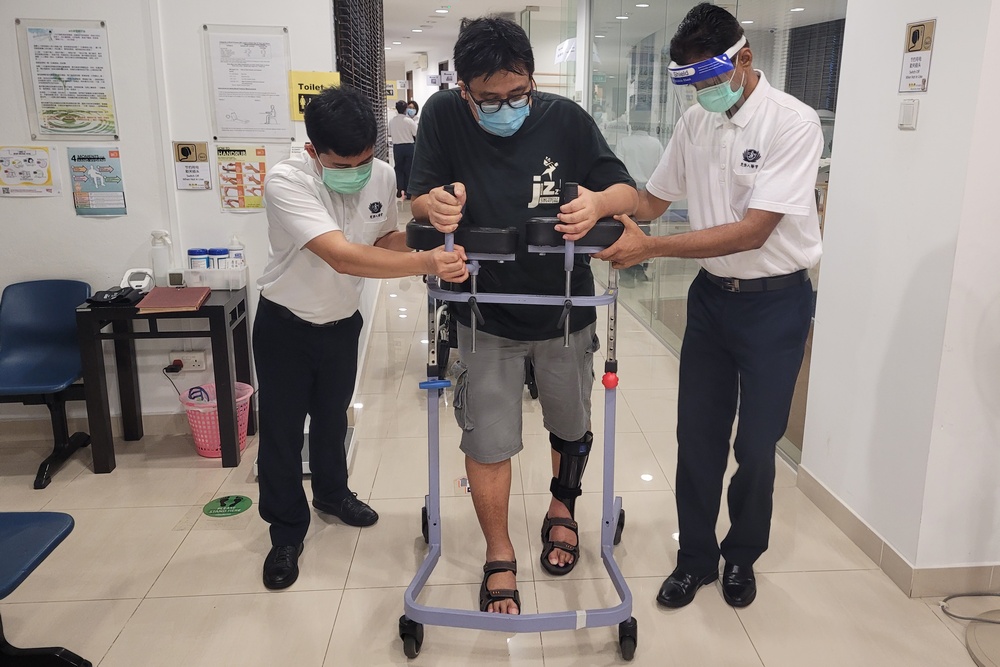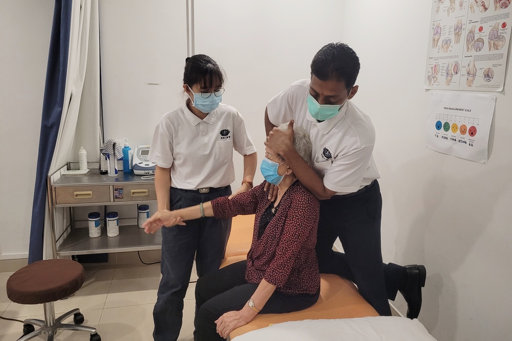 Mr Vinoth in the midst of helping out a patient with some stretching exercises. (Photo by Chan May Ching)