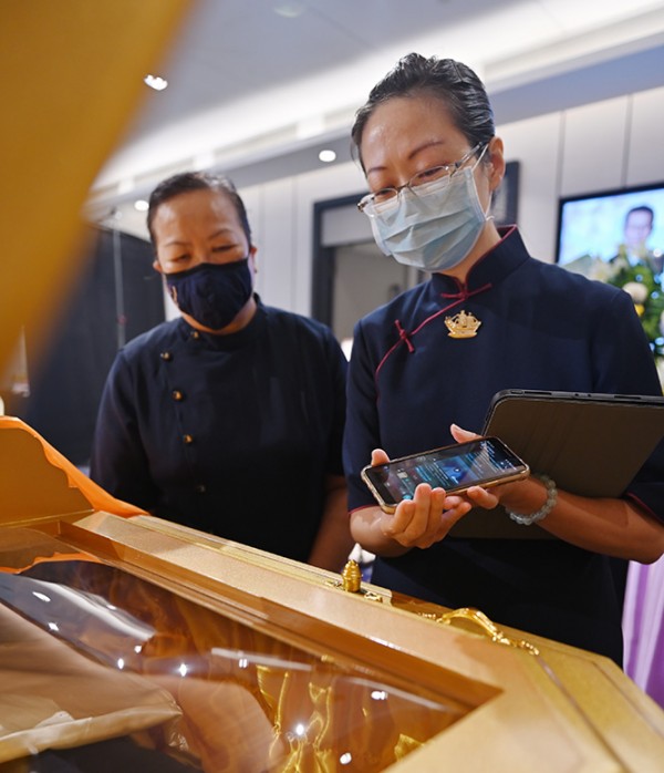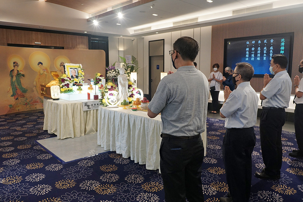 亲友、商业伙伴和慈济人分批前往灵前致哀,图为新加坡慈济执行长(右一)带领同仁代表向沈喜洲致以最高敬意和祝福。(摄/ 吴南凯)