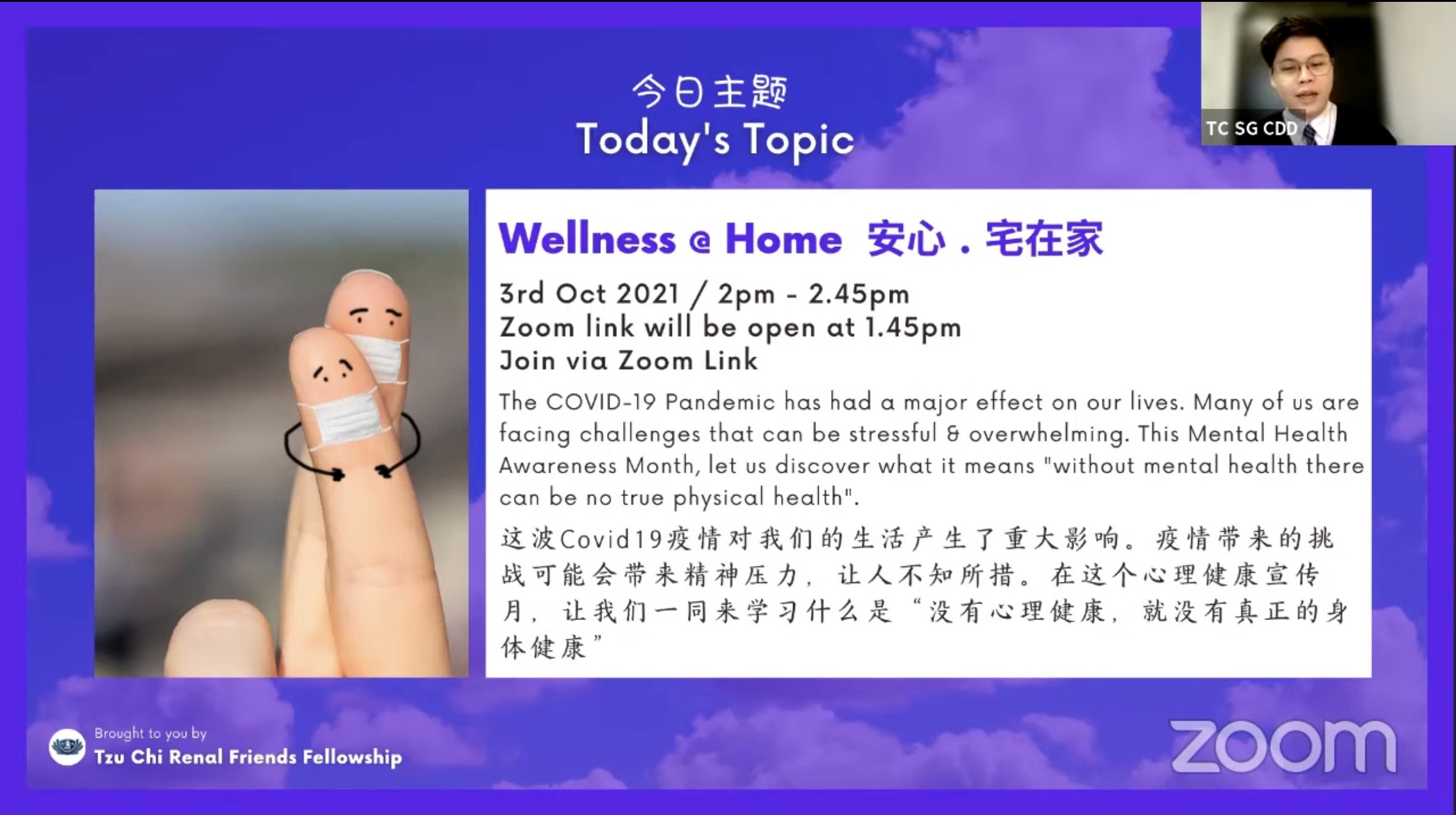 2021年下半年,新加坡的防疫仍在收紧和放松中反复拉扯,防疫下生活形态骤变,也让肾友面对生活和心理上的新挑战,新加坡慈济肾友联谊会定期推出线上直播节目“超级新奇天”,每月一次45分钟的线上节目,涵盖心理健康、卫生教育等主题,希望通过丰富多元活动推广健康,鼓励肾友积极面对生活。