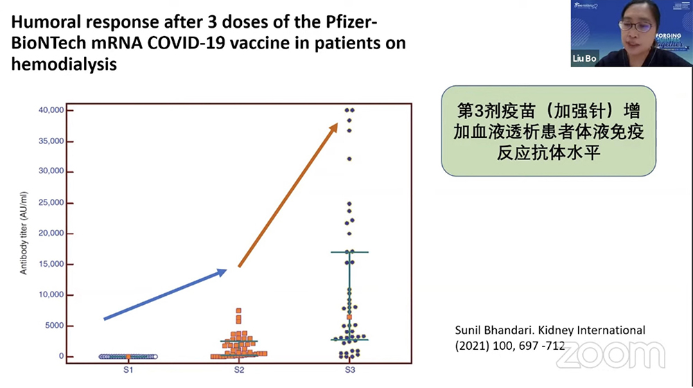 “针对肾病患者,尤其是透析和肾脏移植患者,对疫苗的免疫反应降低,产生的有效抗体相对于健康人群要小很多。英国的研究数据说明,在追加第三剂疫苗后,产生的抗体保护率会显著提高。”