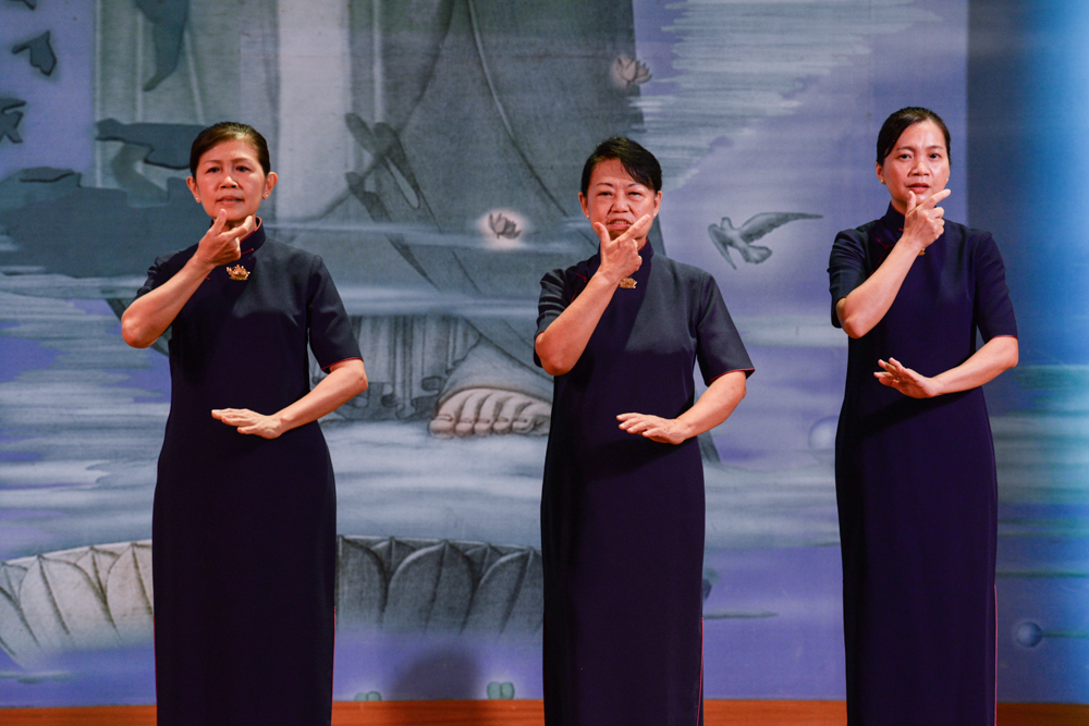 “上人赐我红豆两粒,感恩之情油然而起……难得见师一面,无法侍奉朝夕,幸有红豆两粒,和我时常心语,务把想师之情,点滴溶进慈济。”动人心扉的音乐响起,狮城弟子两年没回静思精舍面见恩师证严上人,九名慈济委员以一首“想师豆”手语演绎,表达对上人之思念。