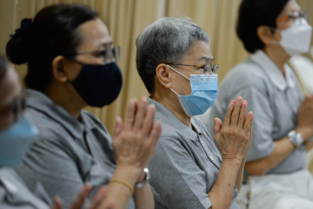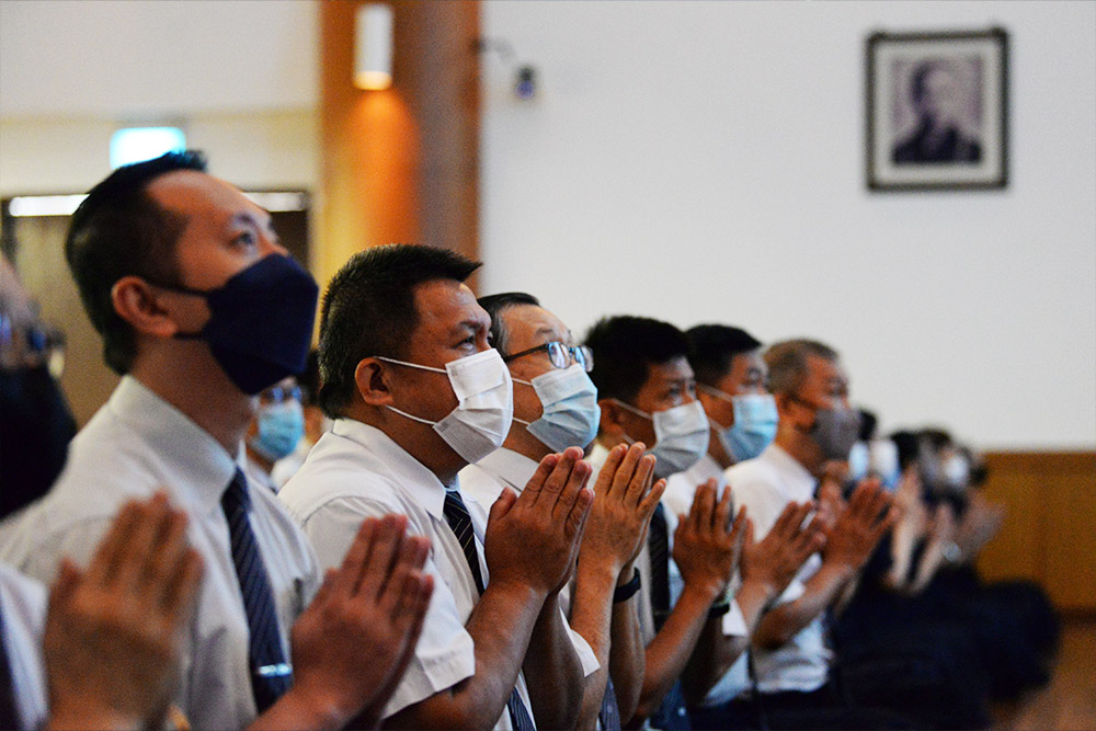 2022年4月24日正逢慈济56周年庆,慈济功德会(新加坡)与台湾花莲静思精舍连线,超过两百人在佛堂虔诚礼诵《药师经》,为众生祈福。(摄/ 蔡佑良)