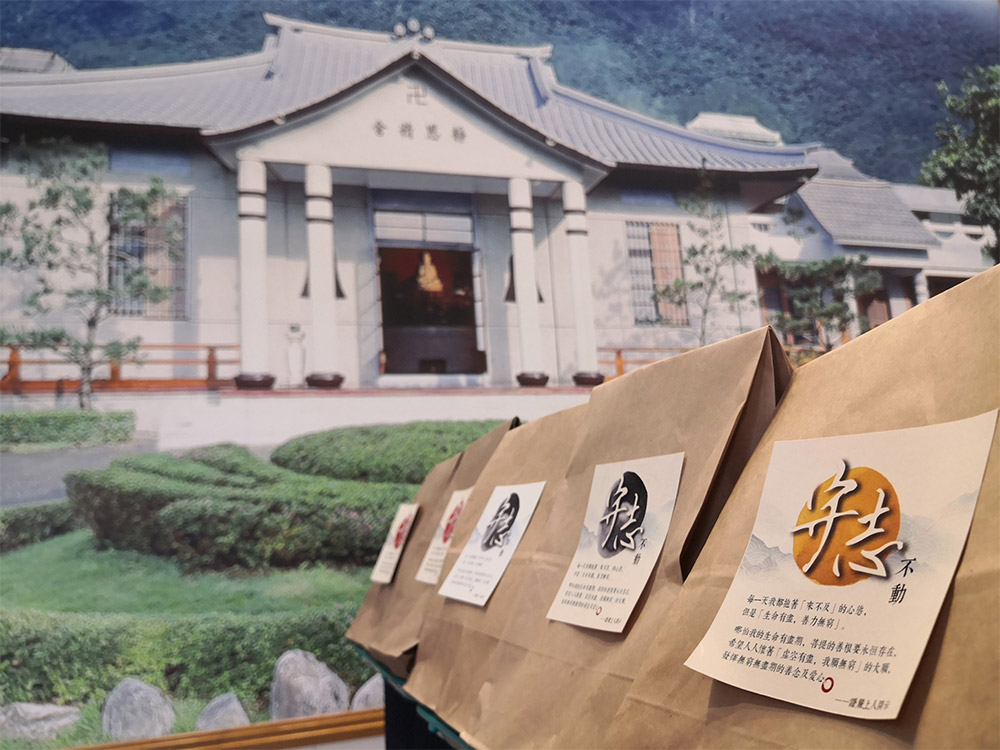 结缘品上贴着“守志不动”小卡片,提醒着静思弟子,一起为上人扛起如来家业的重责与使命。(摄/ 王绥喜)