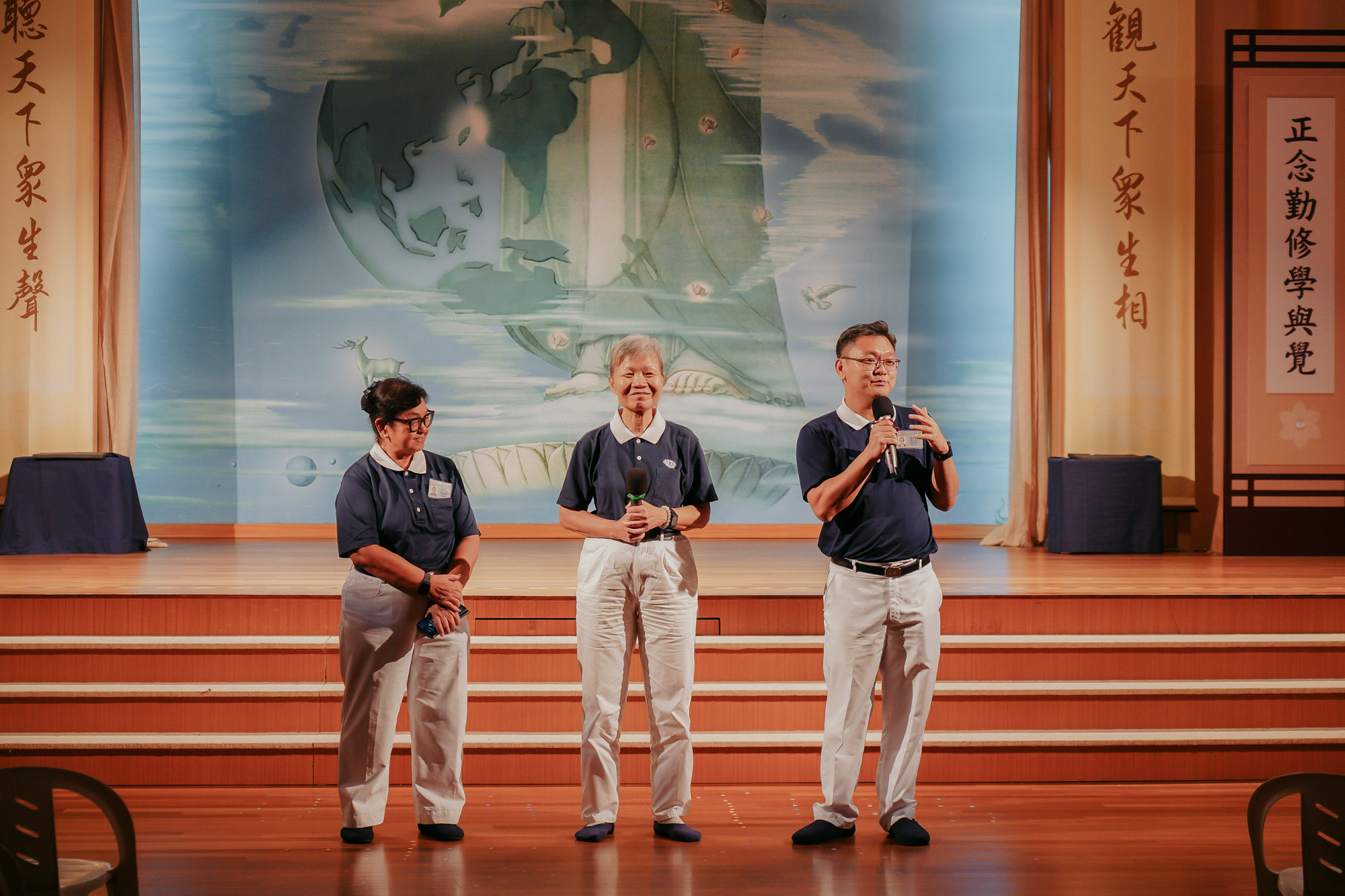 志工们轮流上台分享自己与慈济的因缘。志工陈福龙表示,由于身为德士司机,疫情期间无法工作,在家中观看大爱电视台时,被证严上人和慈济人的故事感动,萌生加入慈济的念头。之后在开德士时,他总会留意慈济的踪迹。皇天不负有心人,某日,陈福龙终于走入新加坡静思堂,受到值班志工余慧铢和黄莉燕接引,从而开始他的慈济旅途。