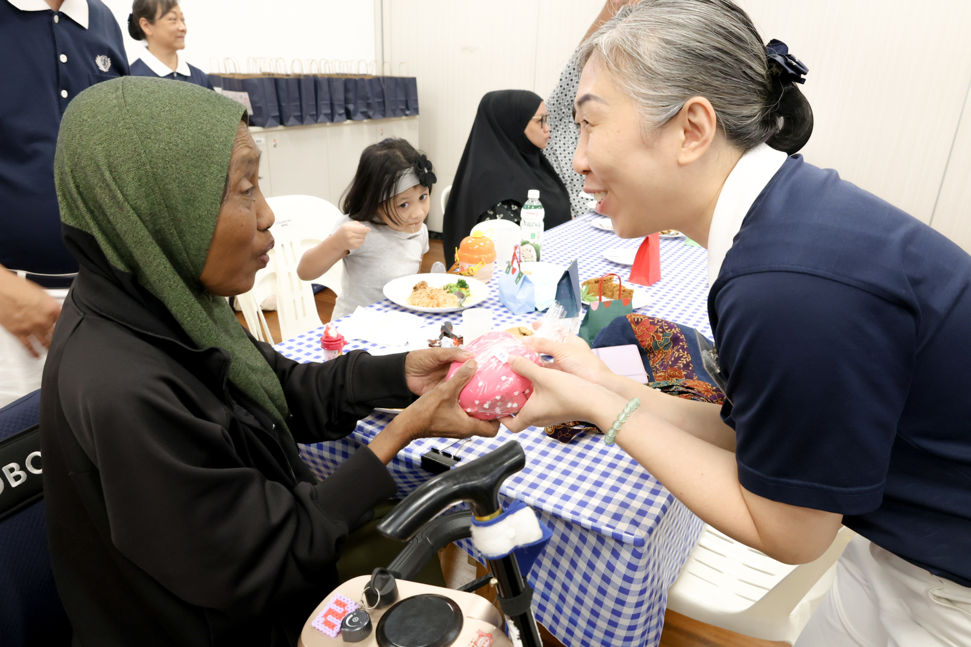 90岁的Mdm Hong(右)双手比心表达感恩。